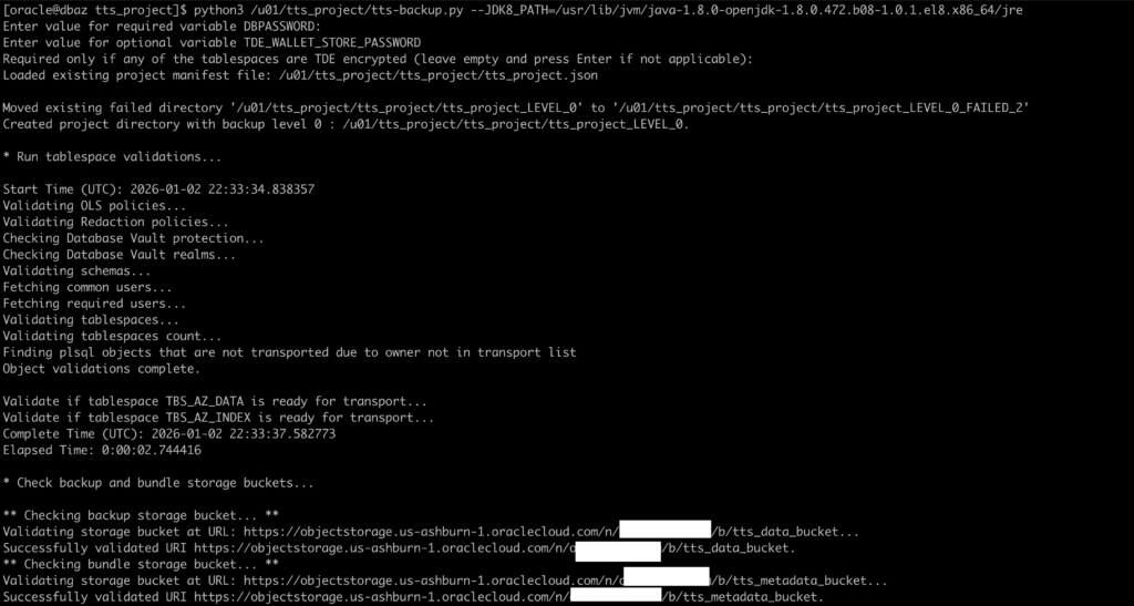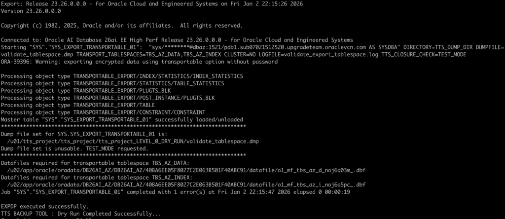 As you can see, everything worked fine. Now, let’s change the tablespaces to read-only, remove the DRY_RUN parameter from the file, and run the script again: