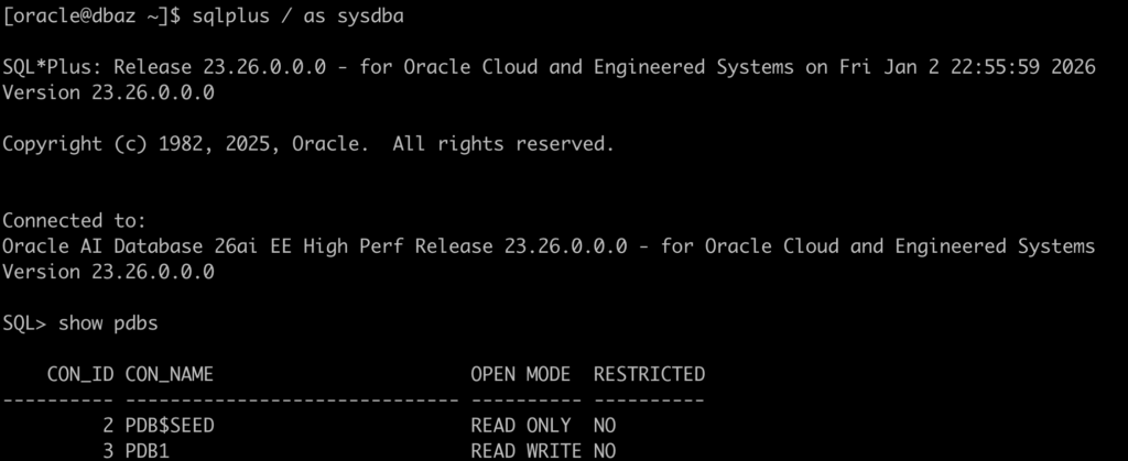 For this test, I will use a BaseDB 26ai to test and a non-incremental backup. In a real-world, critical production migration, you should use incremental backups instead: