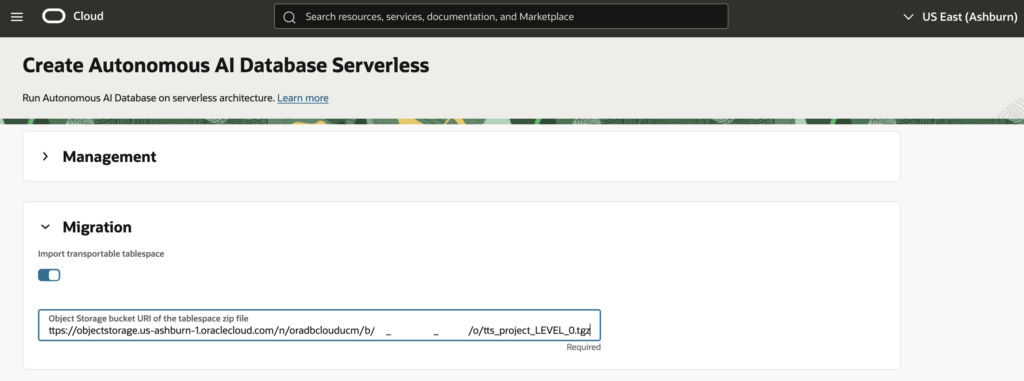 For this test, I am using a non-incremental tablespace backup from the source database. During Oracle AI Autonomous Database creation, you must specify the URL where the backups were written: