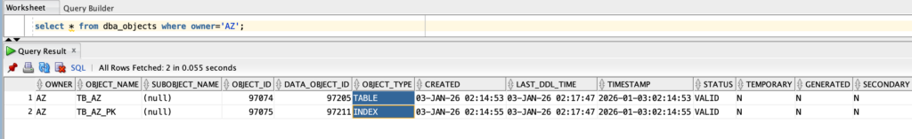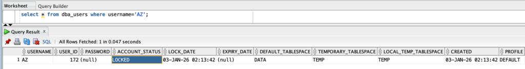 create user az identified by MySupperPasswd2026## default tablespace tbs_az_data;