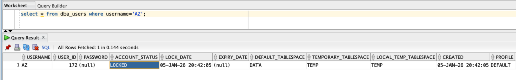 create user az identified by MySupperPasswd2026## default tablespace tbs_az_data;