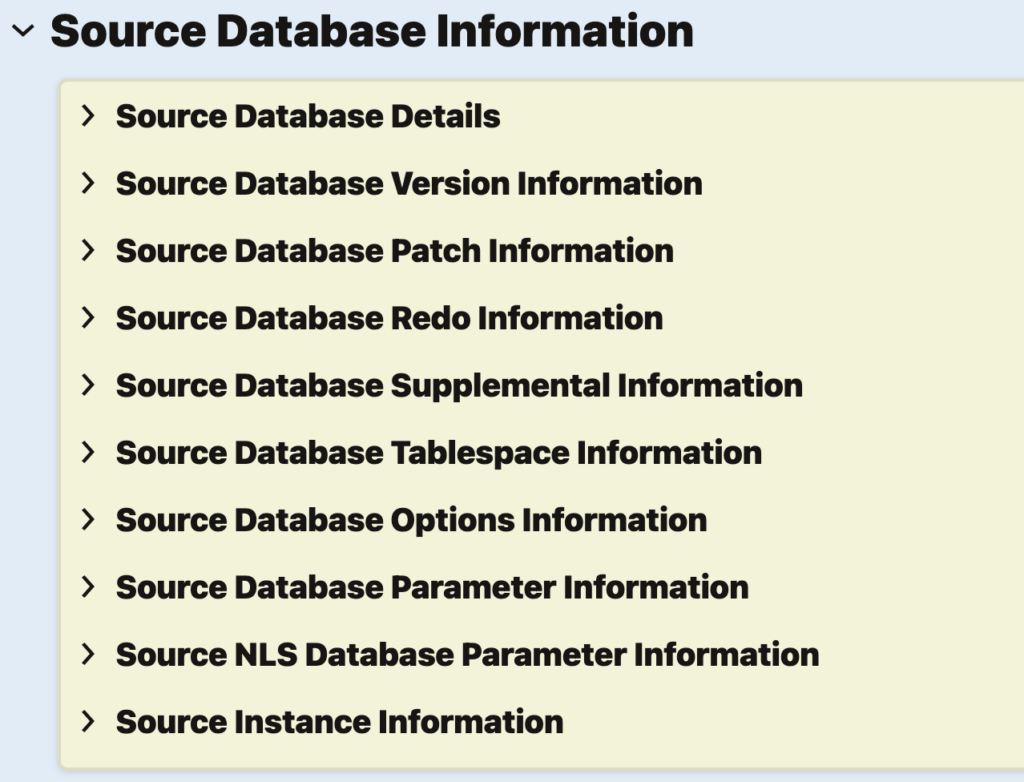 The Source Database Information section gives an overview of the database configuration, including details about the database version, applied patches, redo configuration/amount generated, and other important settings. This information helps you quickly understand the environment where the database is running.