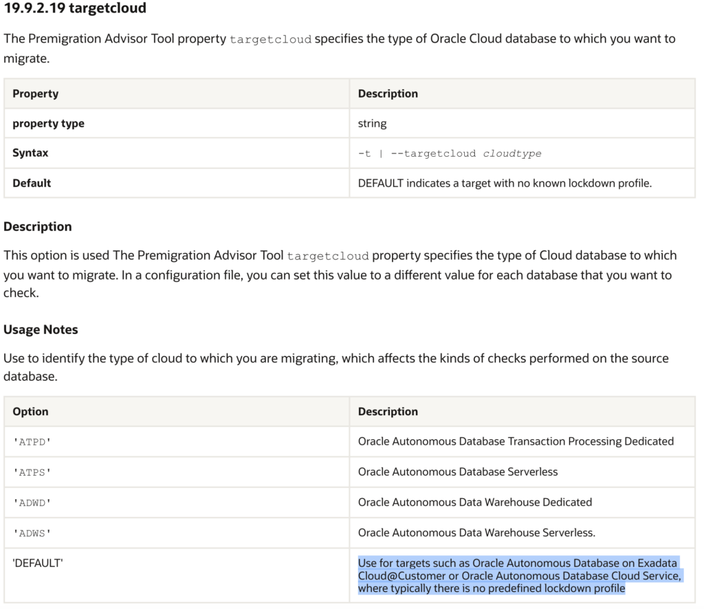 ./premigration.sh --connectstring jdbc:oracle:thin:@cpat19c:1521/ORCL_gbm_fra.sub09232345080.upgteam.oraclevcn.com --sysdba --username SYS --targetcloud DEFAULT --migrationmethod ALL --reportformat JSON HTML TEXT --zip --full --gatherdetails all