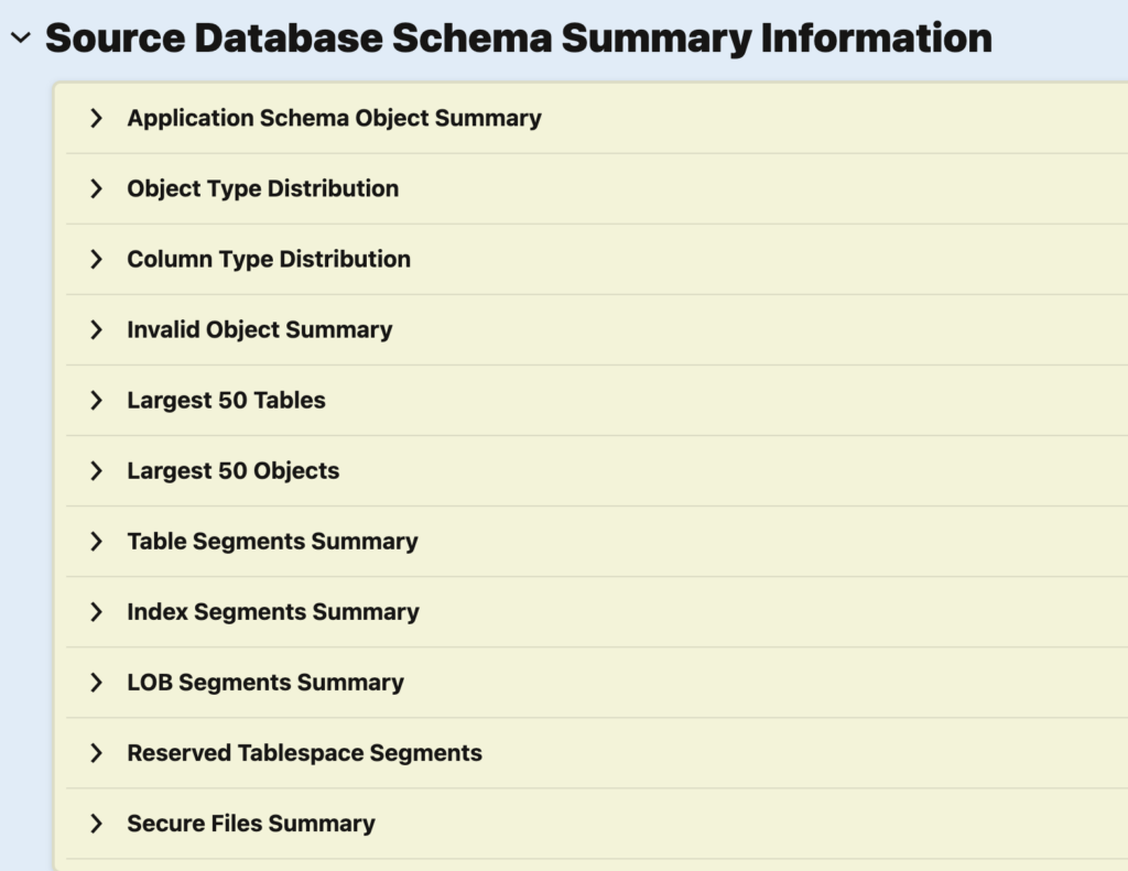 The Source Database Schema Summary Information section focuses on the database objects and storage usage. It provides summaries of application schemas, object type distribution, column data types, and invalid objects. It also highlights the largest tables and objects in the database, which is very helpful when estimating migration effort and identifying large segments that may require special attention.